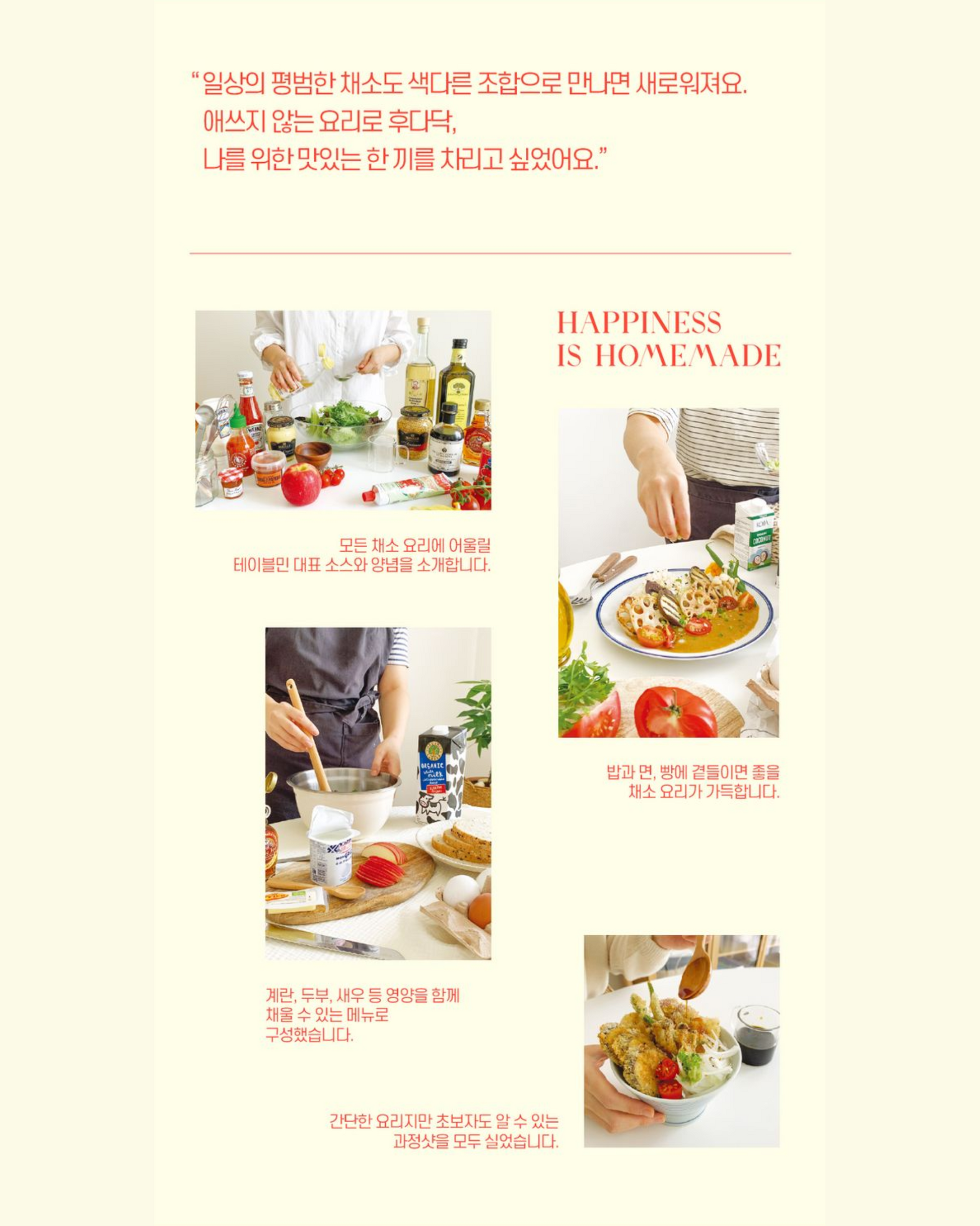 <채소 식탁>是一本「蔬食初學者」也能輕鬆上手的料理書, 強調「為自己料理」,作者強調即使材料不齊,也能依情況靈 活變化,例如以「紅椒粉」代替「柴魚片」、以「青江菜」代替「白菜」