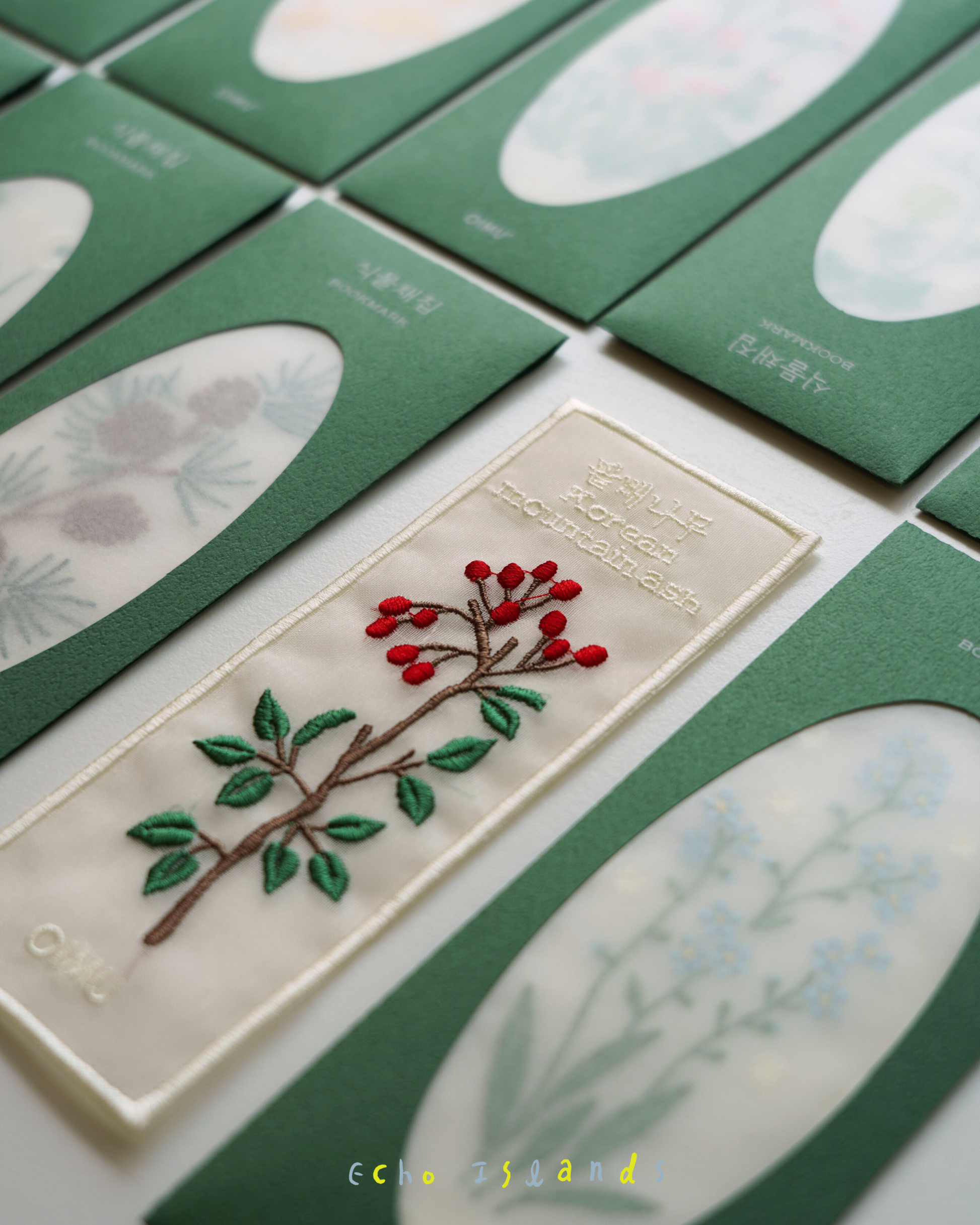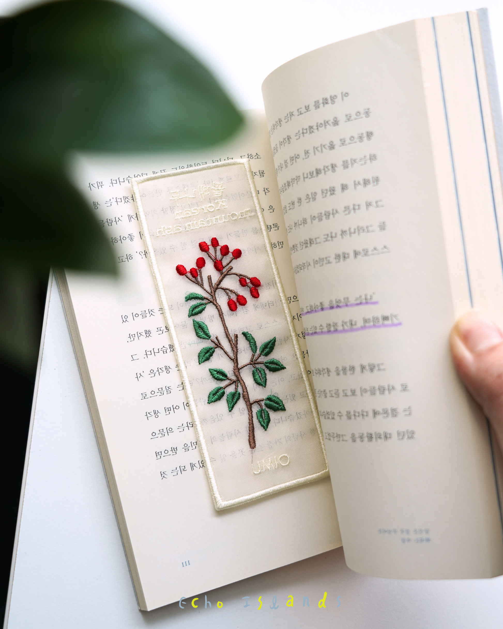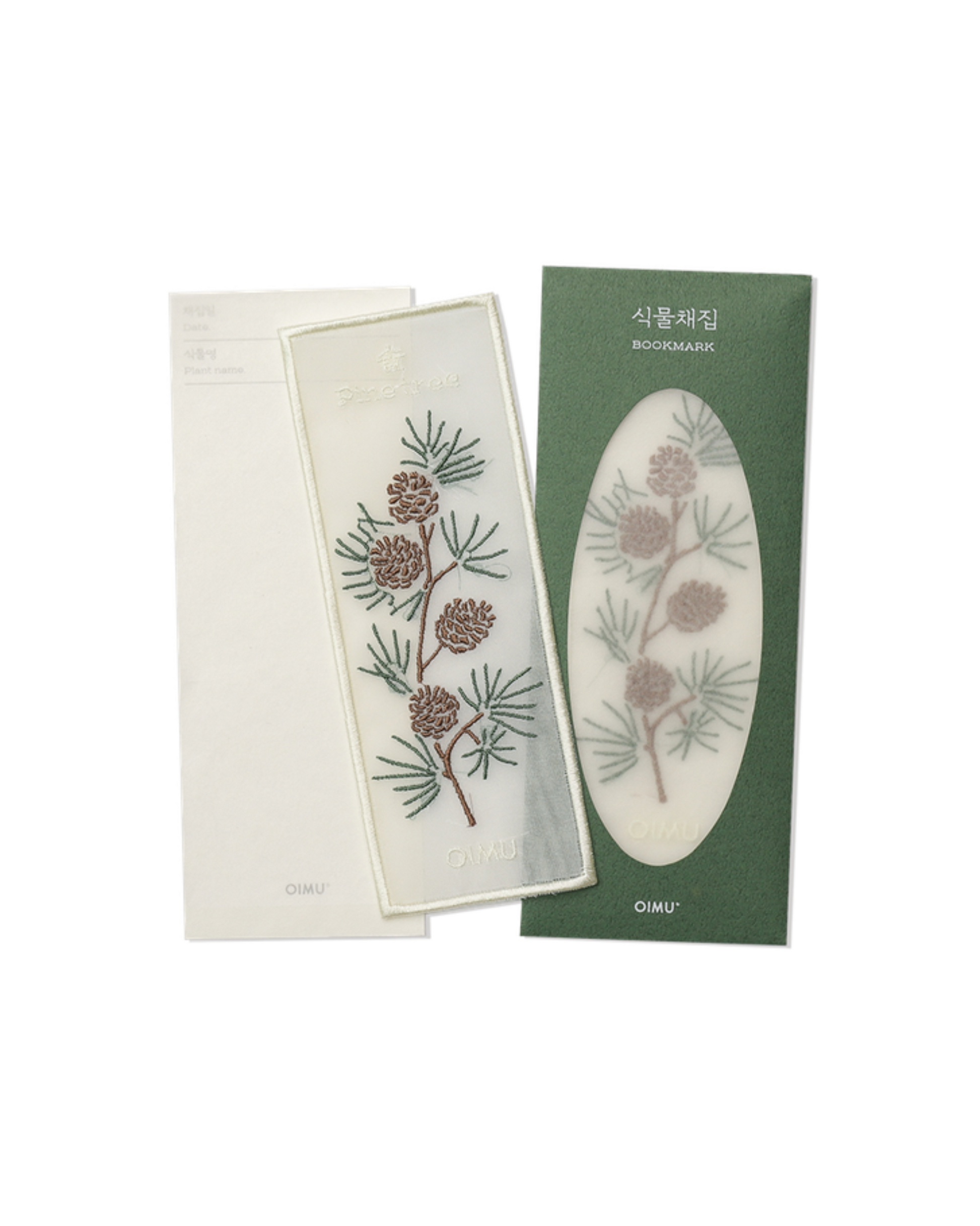 The bookmark is made of the "satin (노방)" fabric commonly used in Korean traditional clothing, and is embroidered with pine trees and pine cones. Two layers of satin are stacked and sewn together on the four sides, making it light yet solid.
