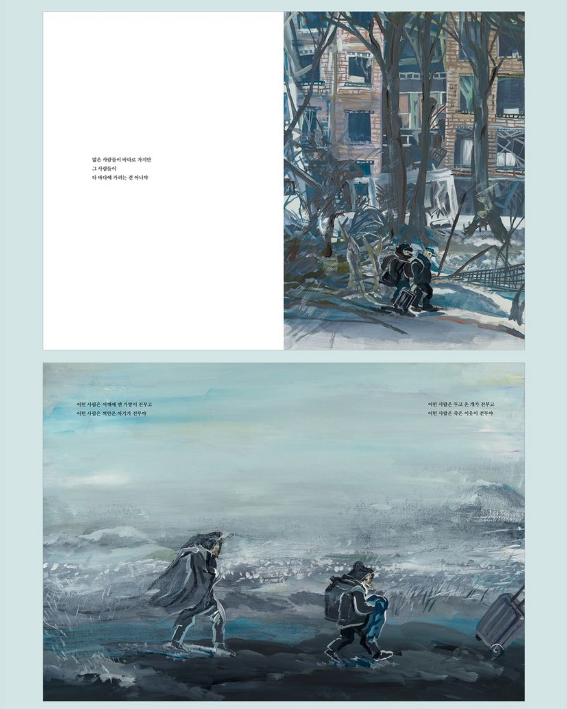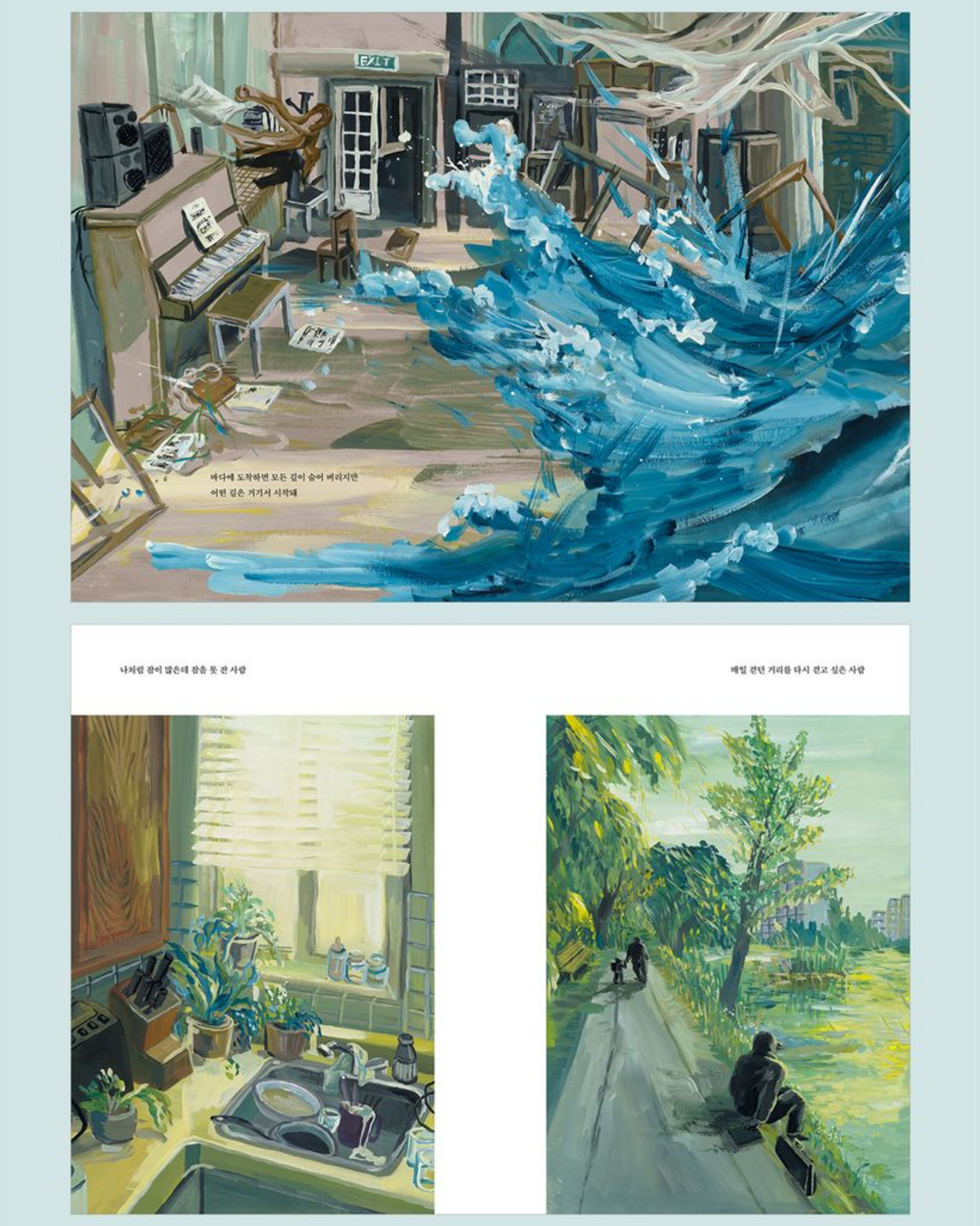 讓《他們奔向大海》成為更具意義作品,來自畫家이수연極具震撼力的圖像表現。이수연過往作品中擅長運用象徵性色彩傳遞情感,以這種方式敲響了無數讀者內心深處的回音。象徵著漫無目的旅程所帶來痛苦的漆黑夜空、朝著耀眼升起的月亮奔馳而去的玩具巴士,那一幕展現出童話般的幻想性,也是本書的高潮場景。