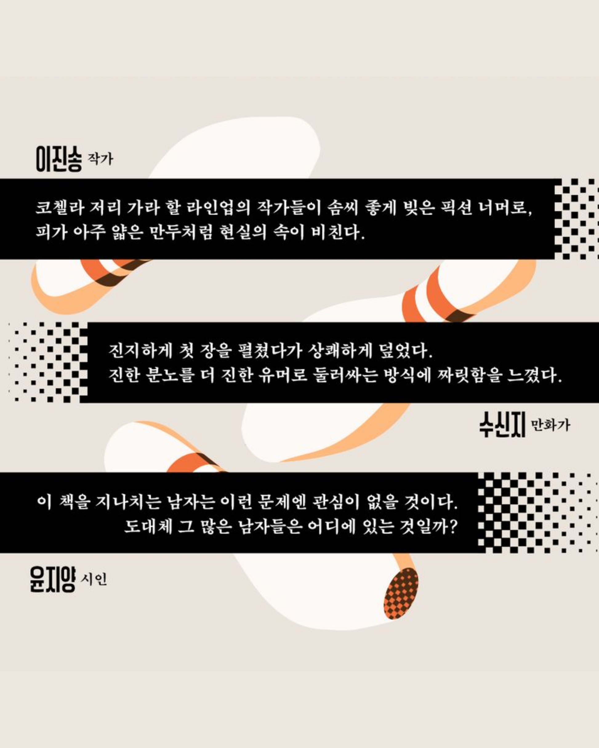 就在那一瞬間,민지형作家感受到「作為女性生活在這個社會裡,長久以來感受到的違和感,竟被一句話完整地整理出來」,而感到一種強烈的快感。對於生活在韓國的女性而言,也許都曾有過類似的瞬間:在新聞裡看到駭人聽聞的犯罪消息時,在看綜藝或電影時,或是在地鐵裡、公司裡、聚餐場合裡,都可能不由自主地感慨說道:「啊……韓國男人實在太多了。」