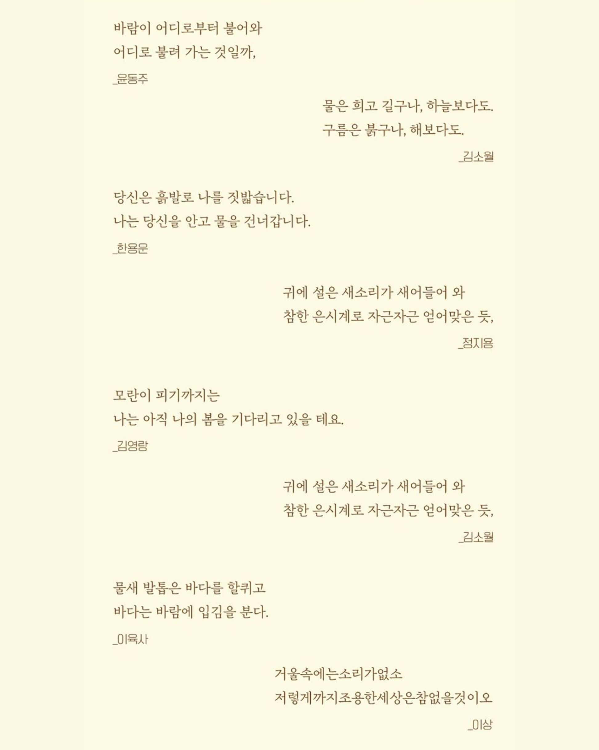 <한국의 아름다운 시>精選了代表韓國文學的七位詩人的作品,分別是尹東柱、金素月、韓龍雲、金永郎、李陸史、鄭芝溶、李箱,從他們的作品中挑選最動人的詩篇,讓讀者在親手抄寫的過程中直接感受詩人傳遞的細膩情感與時代回響。