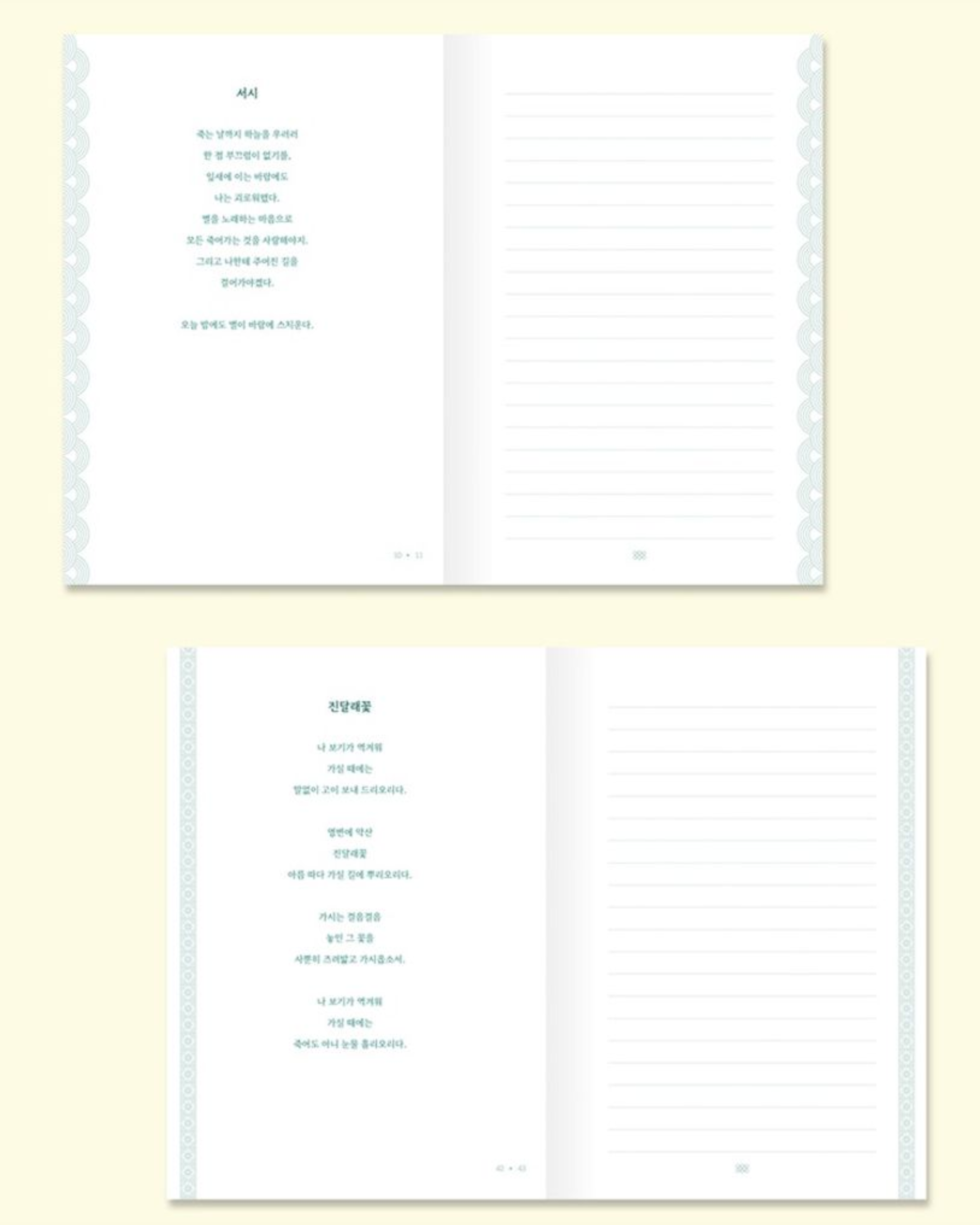 書中每一頁都預留了充足的空白,適合抄寫;每日一首的篇幅,不會造成負擔,輕鬆愉悅地享受書寫時光。讀者在臨摹這些代表韓國文學的詩篇時,不僅能感受詩人的心意與痛楚,也能自然走入詩所存在的時代背景。