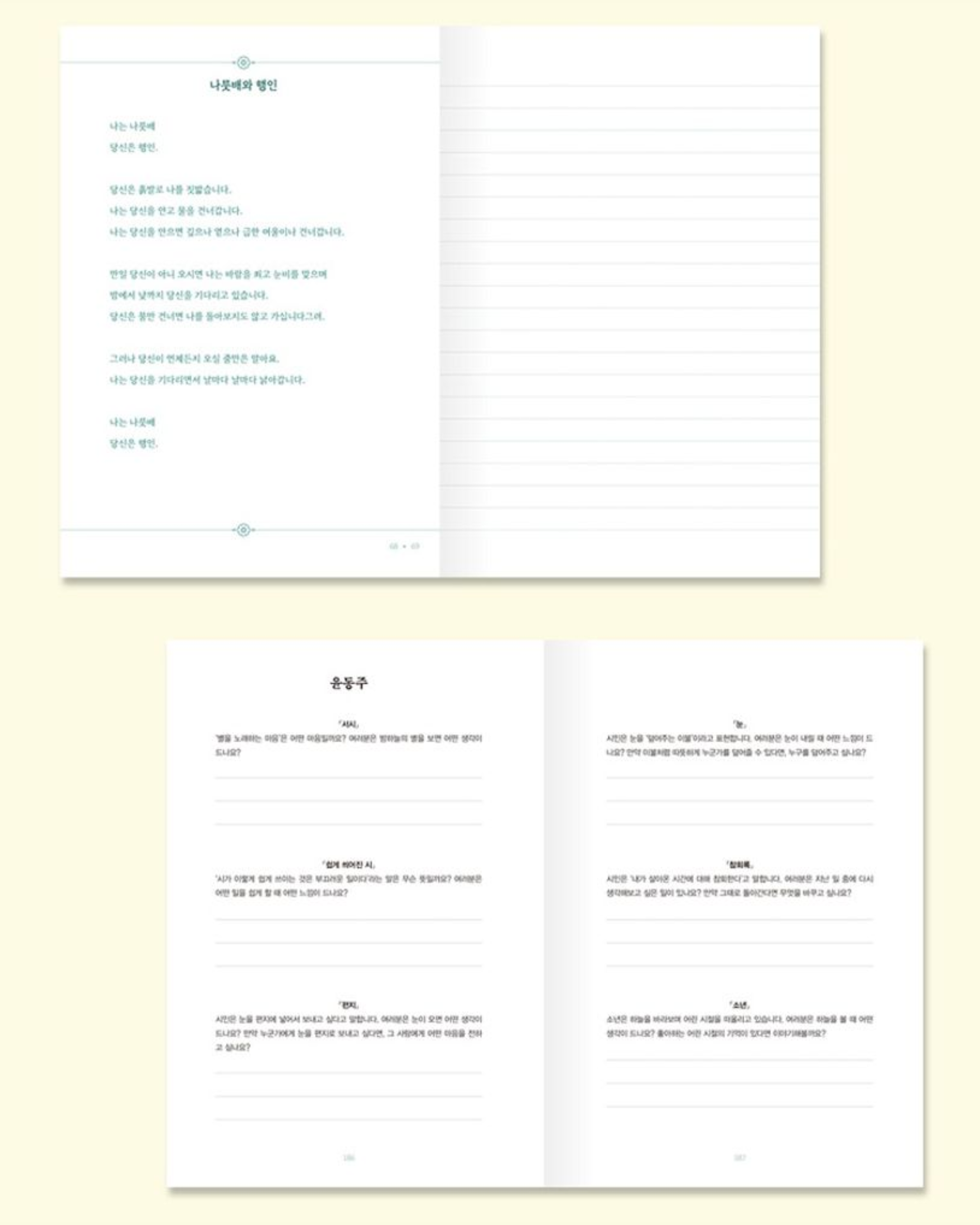 此外,在書的最後還準備了引導式問題,幫助讀者更深入理解詩意,開啟思考與對話的機會。品味詩的意義,用自己的筆跡寫下美麗的韓國詩篇,這個過程本身就是一段珍貴的體驗。