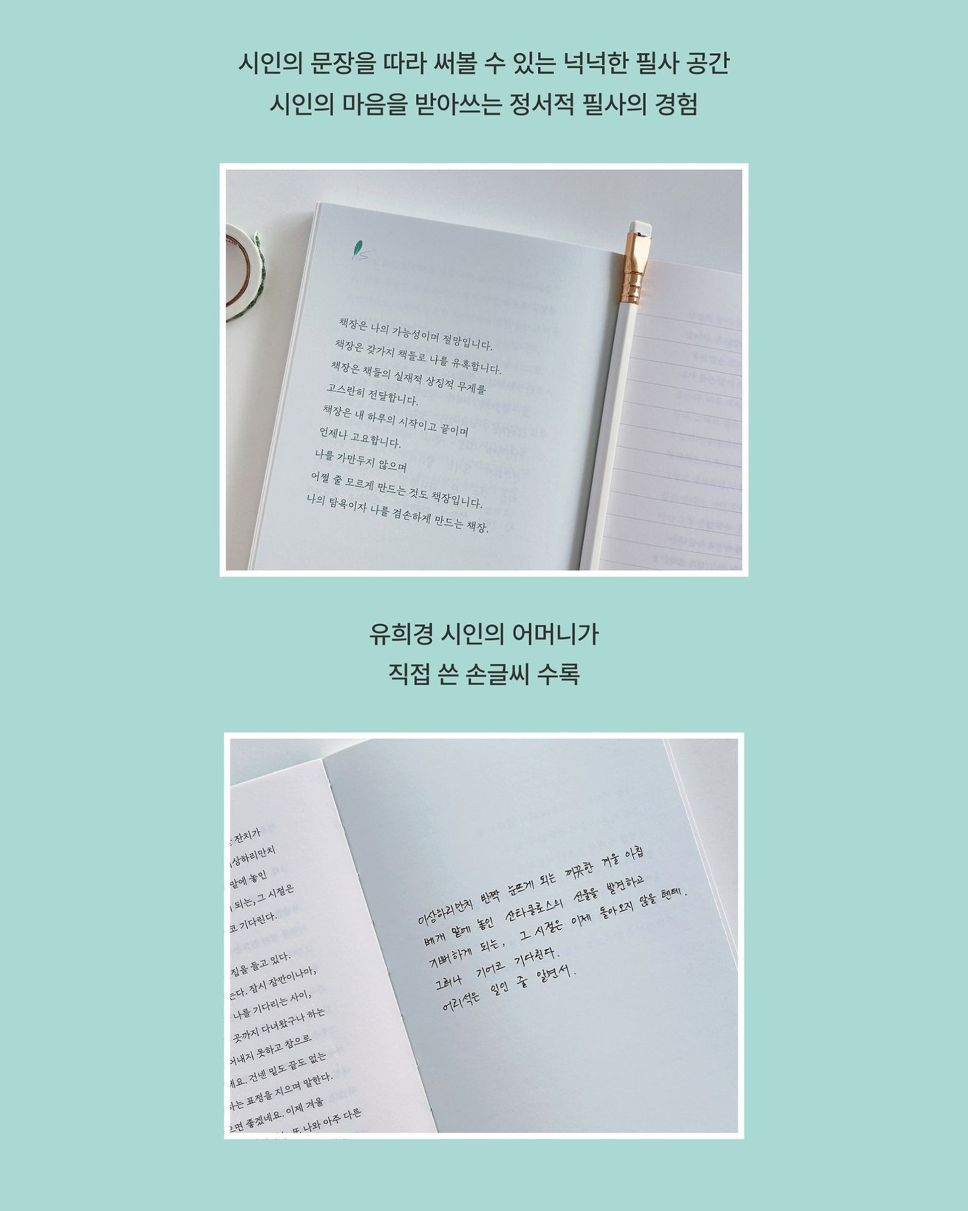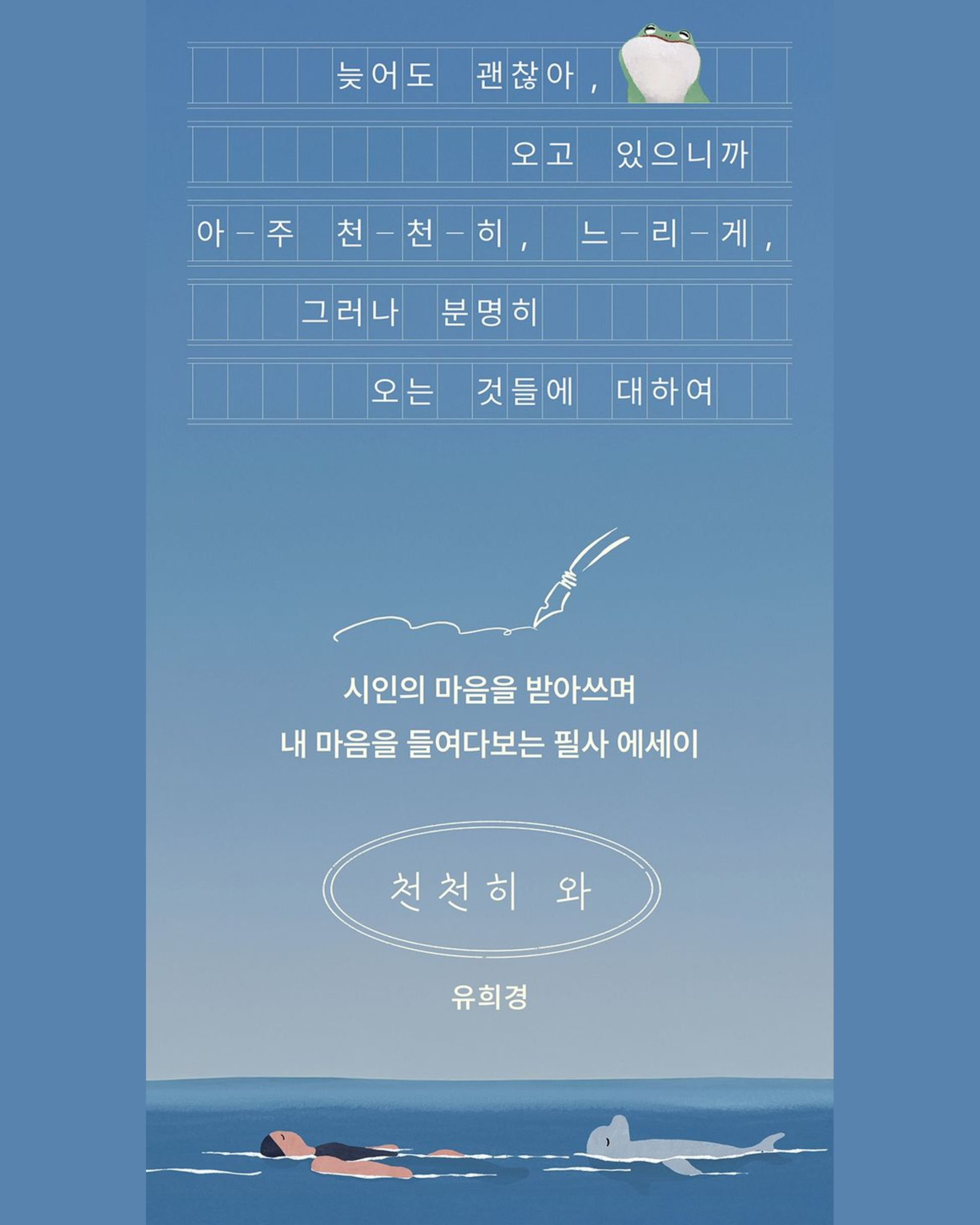 在首爾經營詩集書店Wit n Cynical的詩人유희경,在本書<천천히 와>撰寫 25 篇散文,並搭配讀者能隨之動筆的抄寫空間。詩人認為,「等待」或許更接近一種生命方式。如同他等待客人、等待與某人的對話、等待春天到來、等待初雪降臨。
