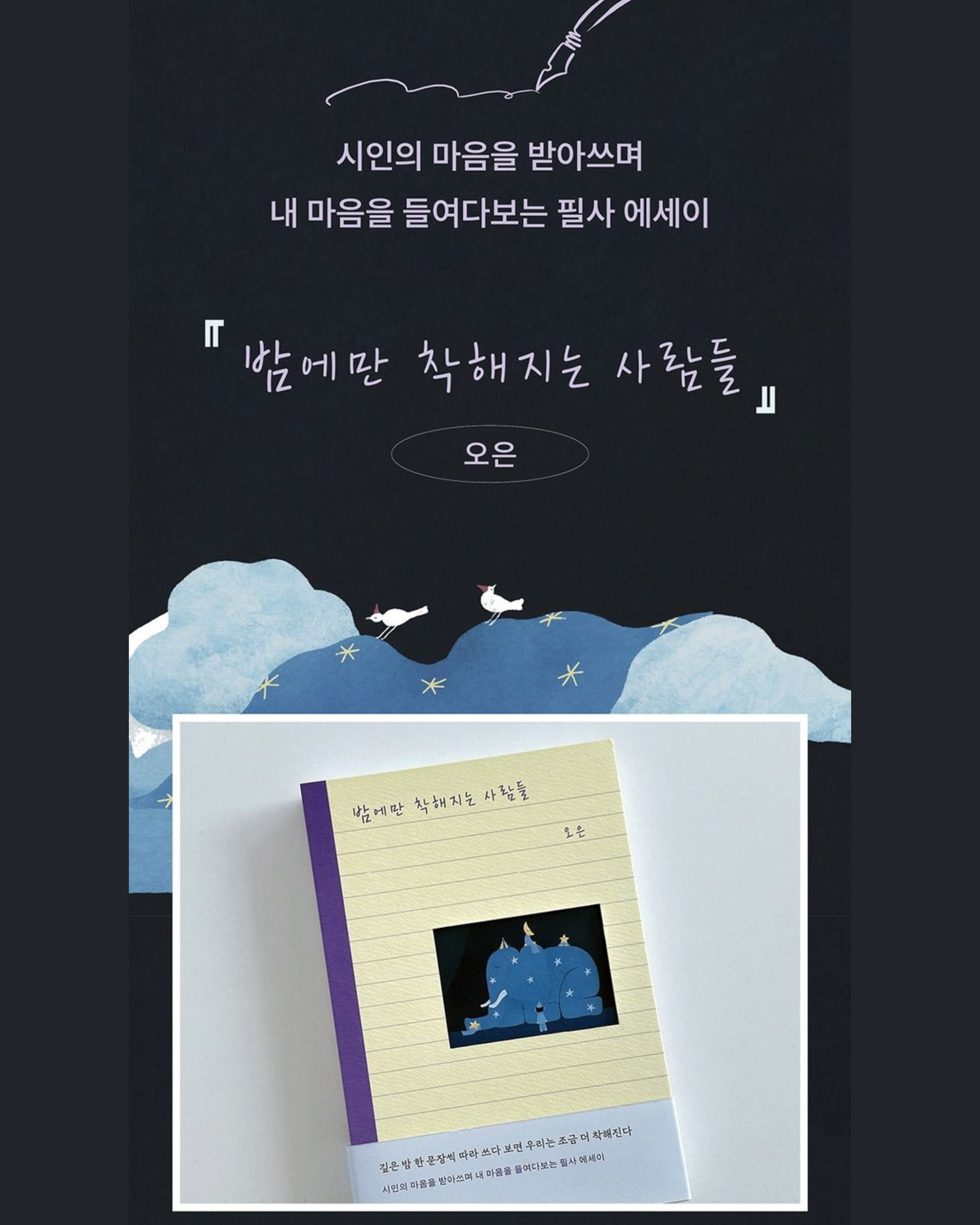 深受讀者喜愛的오은吳恩詩人,全新抄寫散文集《밤에만 착해지는 사람들》,收錄了 24 篇全然感應「夜晚」這一時段而寫成的感性散文,並搭配讓讀者能跟隨詩人筆觸留白的抄寫空間。